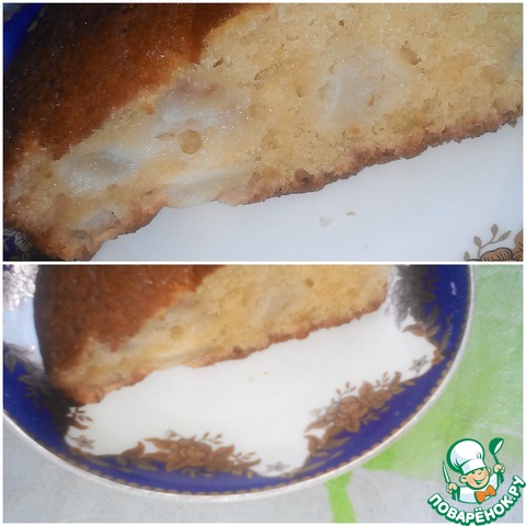 Форму (размером желательно 22 см, у меня была 26), смажьте маслом и посыпьте мукой, переложите в нее тесто и постучите слегка об стол, чтобы тесто равномерно распределилось. Выложите ломтики груш веером на поверхности пирога.