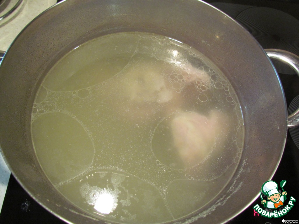 Отвариваем свинину около часа. Мясо режем порционно и отправляем назад в бульон.