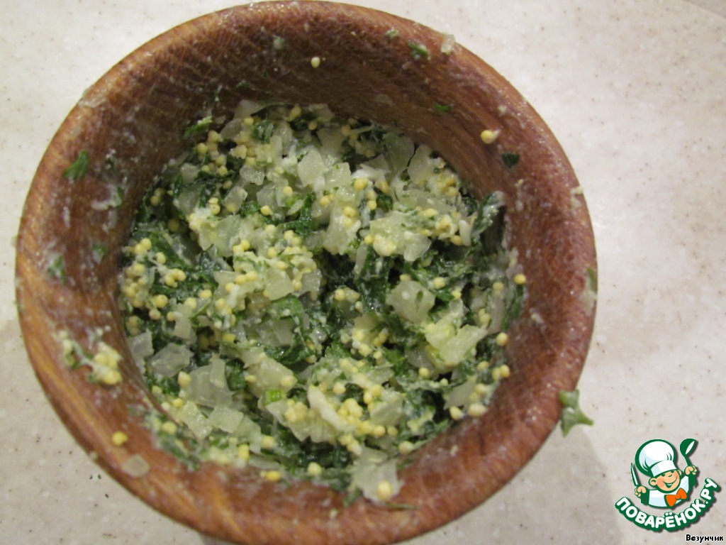Свиное сало пропустить через мясорубку, растереть в ступке вместе с второй нарезанной луковицей, зеленью петрушки и промытым пшеном.