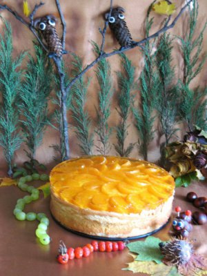 Пирог остудить. Сверху выложить дольки мандарина, залить желе, поставить в холодильник (дать ему застыть). Желе перед нанесением должно "схватиться", в противном случае пирог впитает все в себя.
