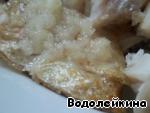 Чеснок с солью по вкусу тщательно истолочь, развести кипяченой водой до состояния негустой сметаны. Готовую рыбу выложить на блюдо и залить чесночный соусом (аккуратно, ложечкой).