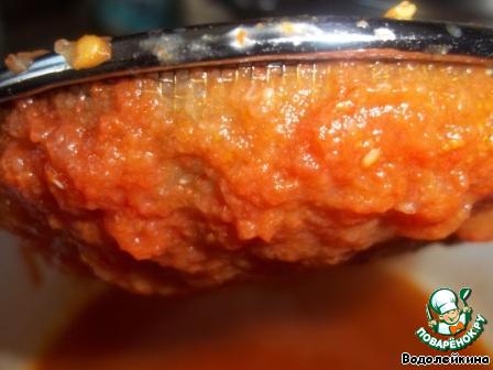 По мере готовности протираем помидорно-луковую массу через сито и закладываем в процеженный первый отвар. Четверть стакана отвара сохранить.
