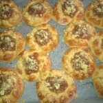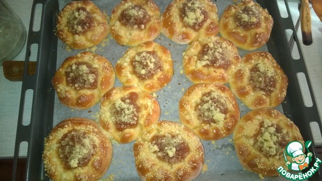 В середину кладем по 1 столовой ложке повидла. Посыпаем штрейзелем.