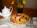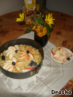 На остывший корж выкладываем ореховую начинку, украшаем яблоками и фруктами (ягодами), крошкой из остатков теста. Выпекаем при 180 градусах 30 минут.