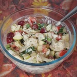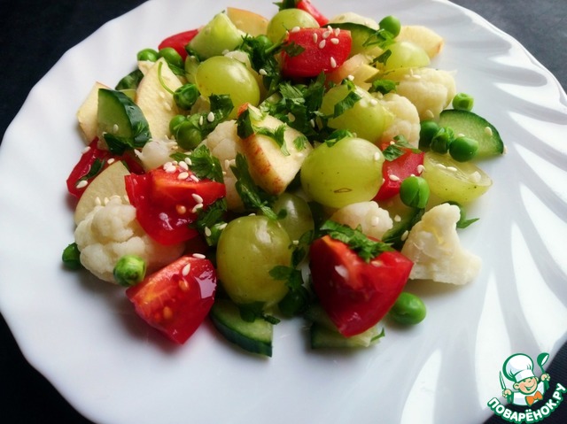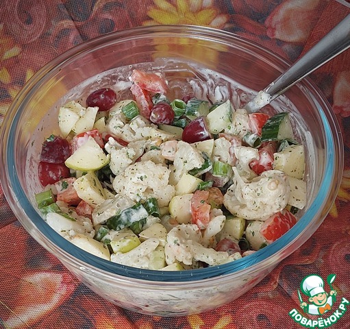 Готовилась к дню рождения дочурки, и хотелось приготовить какой-то новенький салатик. И в журнале "Люблю готовить" нашла такой рецепт. Заинтересовал он меня в первую очередь присутствием цветной капусты (муж - большой ее любитель) и необычным сочетанием овощей и фруктов.