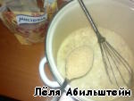 Добавить один стакан муки, размешать, затем аккуратно добавить взбитый белок, размешать.