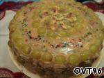 Коржи остудить. Каждый корж разрезать пополам (горизонтально), промазать кремом. Верх и бока торта тоже промазать кремом. Оставить пропитываться на 4-5 часов. Верх украсить по своему желанию. В первый раз я делала с бананами, а в этот раз я решила украсить верх торта виноградом, а еще в середину торта между коржами можно выложить нарезанные бананы, а можно бананы и в сам крем. Получается тоже очень вкусно.