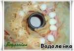 Сверху на ветчину выкладываем отварные перепелиные яйца. Яйца посыпать натертым сыром (примерно половиной).