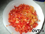 Болгарский перец помыть, освободить от семян, нарезать небольшими кубиками. Перец можно взять разных цветов (я брала красный и оранжевый)