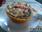 Выложить салат в апельсиновые тарелочки, сверху посыпать кунжутом. Салат готов.