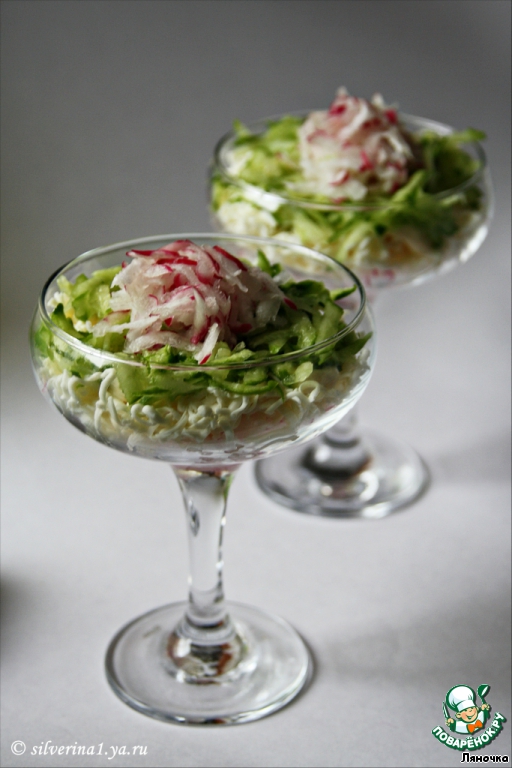 И еще. Такой салат можно подавать не только в салатнике, но и в порционных креманках. Главное, чтобы салатник или креманки были прозрачные. Очень красиво смотрятся со стороны слои салата.
