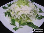 Хочу поделиться еще одним рецептом. На этот раз - салата. Рецепт взят из журнала "Школа гастронома". Приготовила к приходу гостей на пробу. И, если честно, то я даже и не ожидала, что салат будет съеден за короткое время. Салат получается очень сочный и нежный.