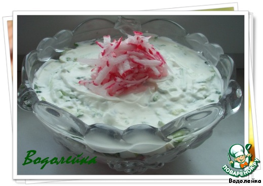 Салат желательно делать незадолго перед подачей, иначе редис и огурец пустят сок.