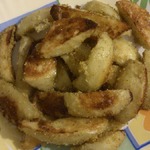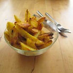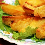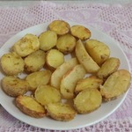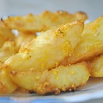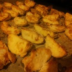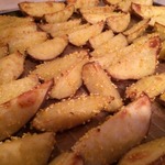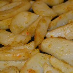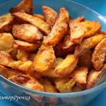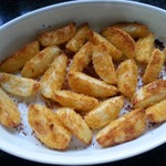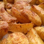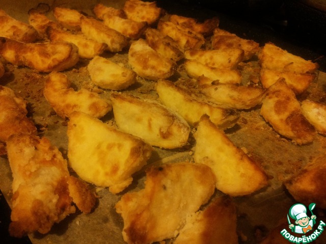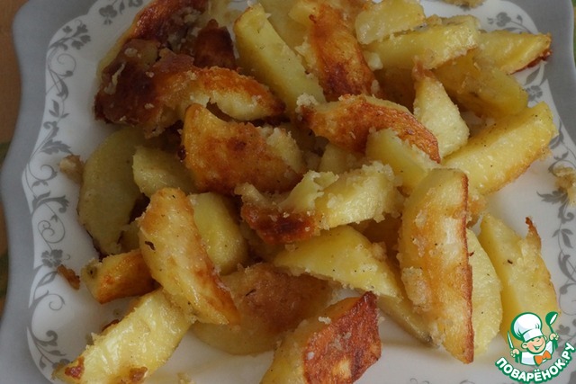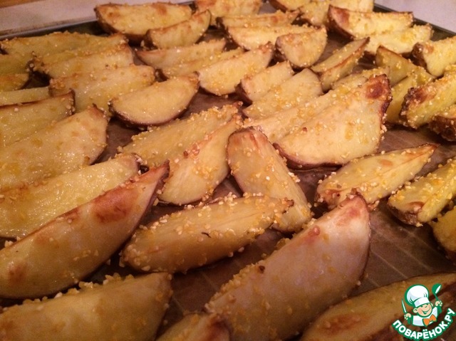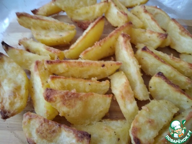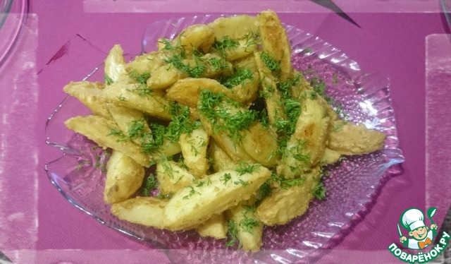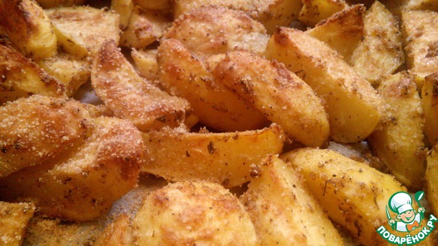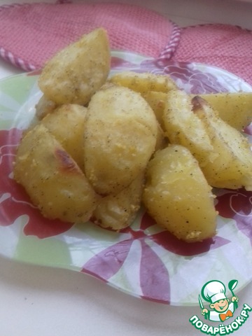 Выложить четвертинки картофеля на противень. Температуру духовки выставить на t=200~220°C. Запекать картофель до мягкости и до яркой корочки. Подавать горячим.