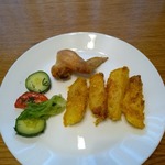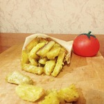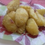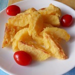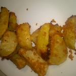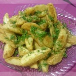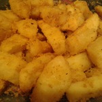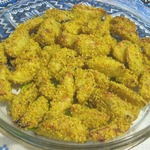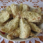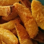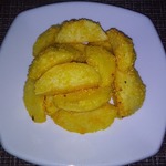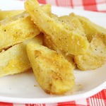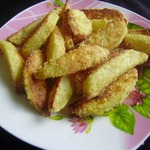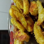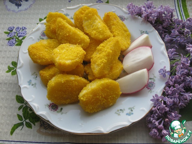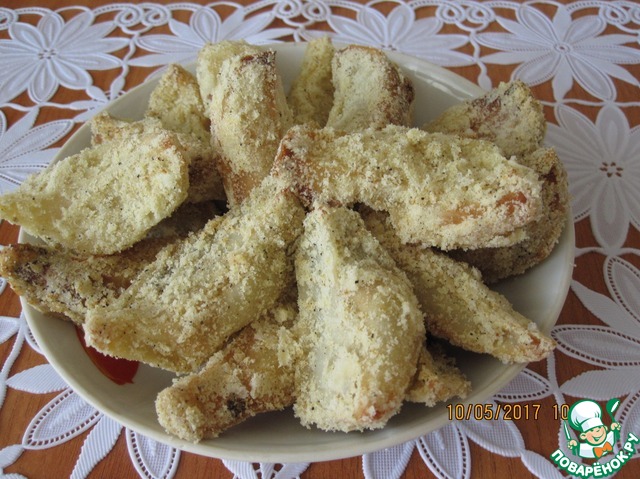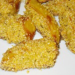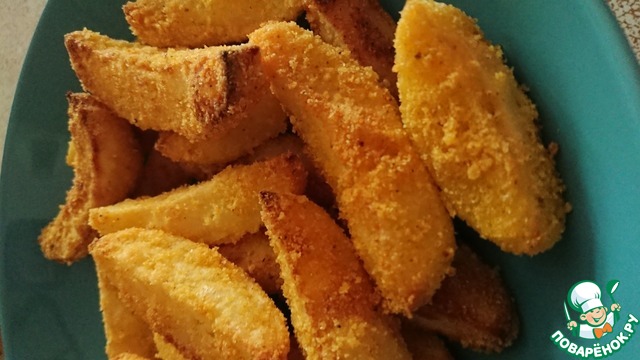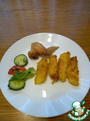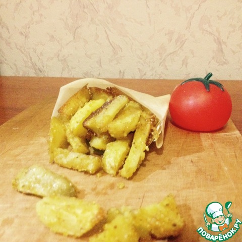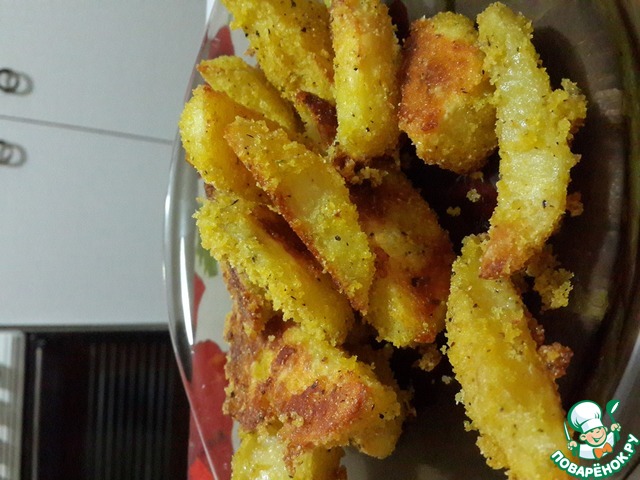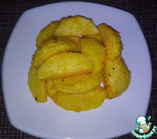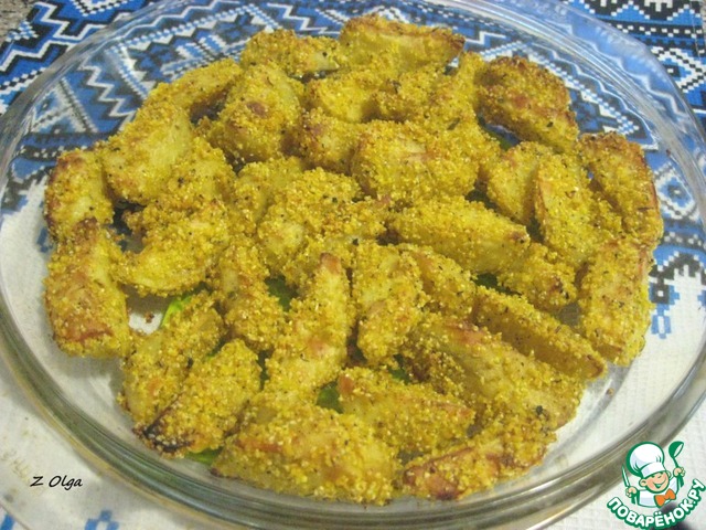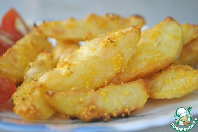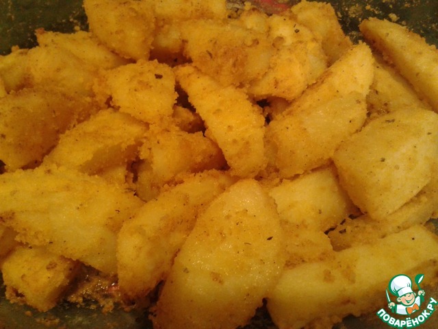 Влить оливковое масло, всыпать соль, перец и приправу, кукурузную крупу (или муку), размешать. (Можно сделать это в полиэтиленовом пакете - очень хорошо панировка распределяется по картофелю).