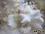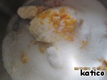 полторы столовые ложки мягкого сливочного масла (около 100 г) смешать с сахаром, цедрой, яйцами.