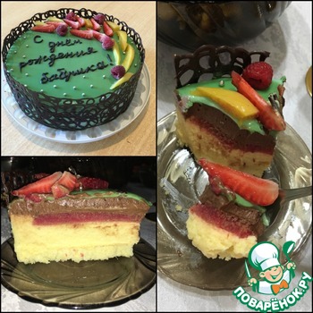 По этому поводу сей торт и был приготовлен. Очень вкусный! Собрала массу восторженных отзывов от тех, кто успел попробовать. А теперь, о некоторых нюансах. Сам манговый мусс (при всей моей любви к манго) мне пах тыквой какой-то. В следующий раз добавлю цедру лимона или поменяю на персики. Глазурь для верхнего покрытия почему-то получилась густая и не растеклась ровно (см. фото). Зато, порадовал шоколадный мусс, который изначально напугал меня своим описанием. Подумываю его использовать и в других рецептах.
