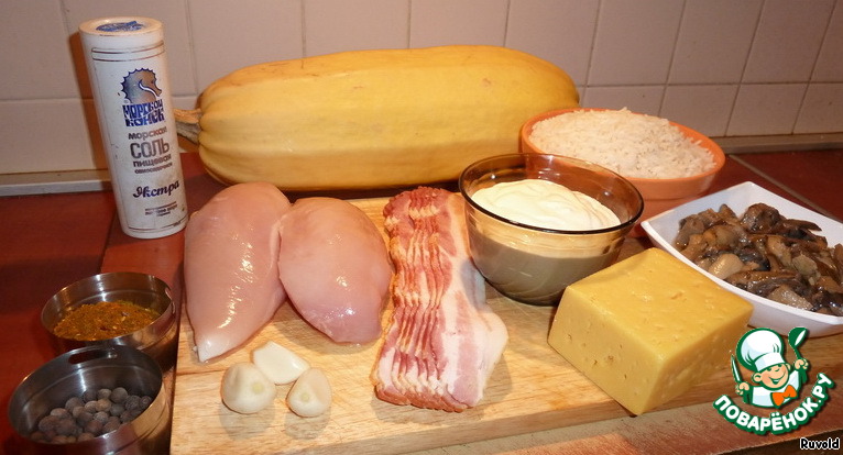 Что же нам понадобится? Естественно, сам кабачок, выберем самый красивый, крупный и желтобокий. Почистим немного чесночка, три дольки нас вполне устроят, как раз хватит для лёгкой чесночной нотки, пакетик сметаны для сливочного оттенка и несколько полосок бекона, привкус копчёностей тоже будет уместен. Для начинки достанем из морозилки пару кусочков куриного филе и немножко белых грибов, они были предварительно отварены, заморожены и, наконец, дождались своего часа, отваренный рис нам тоже не помешает, осталось только выбрать любимые приправы и достать кусочек сыра.
