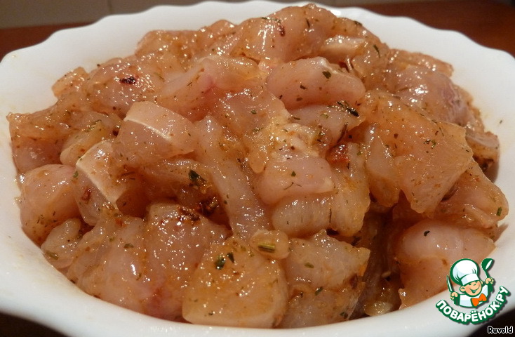 А мы пока нарежем некрупными кусочками куриное филе. Сложим его в тарелочку, добавим немножко подсолнечного масла, соли и любимых приправ. Лично я истолок в ступке душистый перчик и добавил смесь специй для курицы, которую покупал на рынке у замечательного человека дружественной нам народности. Не буду перечислять, что именно туда входит, да уже и не помню, но мне очень нравится. А вы можете использовать то, что Вам по душе. С курочкой разобрались, всё добавили, отставим в сторонку, пусть промаринуется и впитает себя ароматы приправ.