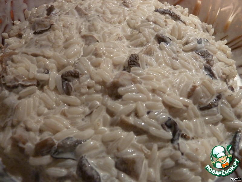 Будем готовить начинку. Это очень просто, нужно всего лишь смешать отваренный рис с белыми грибочками, заправить сметаной и немножечко посолить. Вуаля! И наша начинка готова! Можно было добавить ещё куркумы для красивого желтого цвета, но тогда немного поменяется вкус, а нам этого не нужно.
