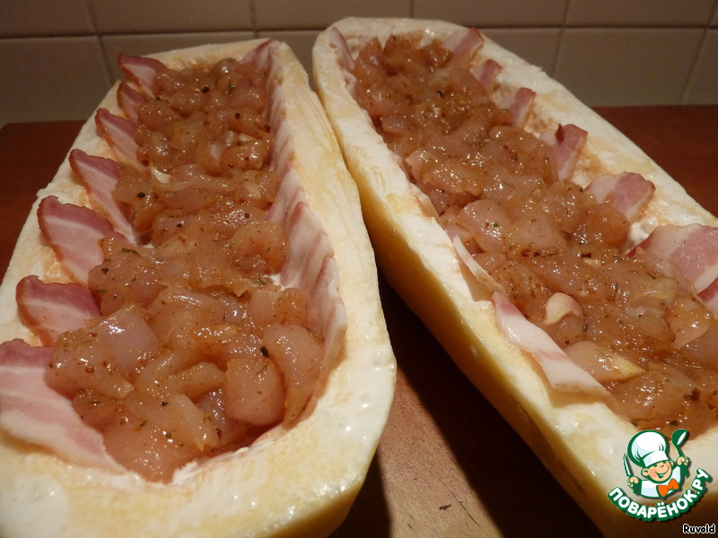 Курочка уже пропиталась приправами и можно наполнять половинки кабачков. Этим и займёмся. Разделим замаринованные кусочки филе на две равные части и аккуратно выложим на бекон. При готовке филе пропитается копчёным ароматом бекона и станет только вкусней. А это, согласитесь, очень даже неплохо.