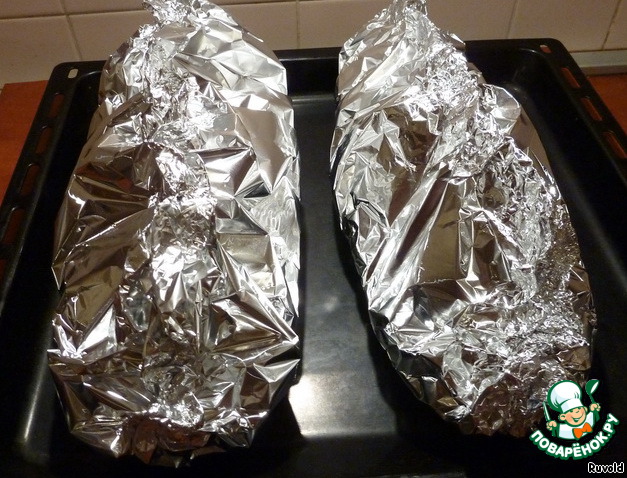 Осталось только достать рулончик фольги и отрезать он неё изрядные куски, такие, чтобы при заворачивании кабачков она не коснулась начинки и не помяла её. Смажем фольгу подсолнечным маслом и аккуратно завернём. Смотрите, какие брикеты у нас получились. Переложим их на большой противень и поставим в разогретую до 160-170 градусов духовку на час или полтора, пока кабачок не станет мягким. А определить его мягкость очень просто, так же, как проверяют картошку, просто проткните его зубочисткой, она должна входить без усилия.