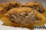 Пришла очередь и нашей рисово-грибной начинки, сделаем из неё шубку для курицы. Возьмём ложку и осторожно выложим горкой на кабачки. Приправленная сметаной начинка даст сок и пропитает сливочным вкусом отдыхающую под ней курочку. Если честно, такая начинка вкусна и как гарнир, если бы я не знал, что она понадобится для кабачков, и не сдерживал себя, то её бы изрядно поубавилось. Пришлось собраться и проявить силу воли. Обошёлся всего парой ложечек, убеждая себя в том, что лишь пробую начинку для проверки количества соли.