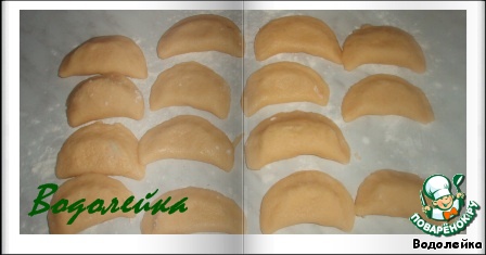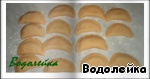 Теперь поступаем так, как с варениками. Берем кружок теста, выкладываем на него яблочную дольку и хорошо слепим края.