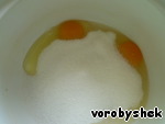 Яично-сахарную смесь соединить с молоком с дрожжами, растопленным смальцем и мукой.