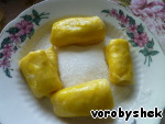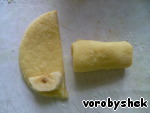 Раскатать тонко тесто, вырезать кружки, разрезать их напополам. На полученный кусочек теста, на край, положить дольку банана и завернуть.