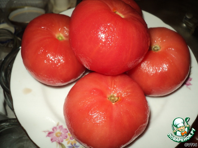 Упругие помидоры обдать кипятком, у плодоножки сделать надрез крестиком. Затем поместить в кипящую воду на две-три минуты.