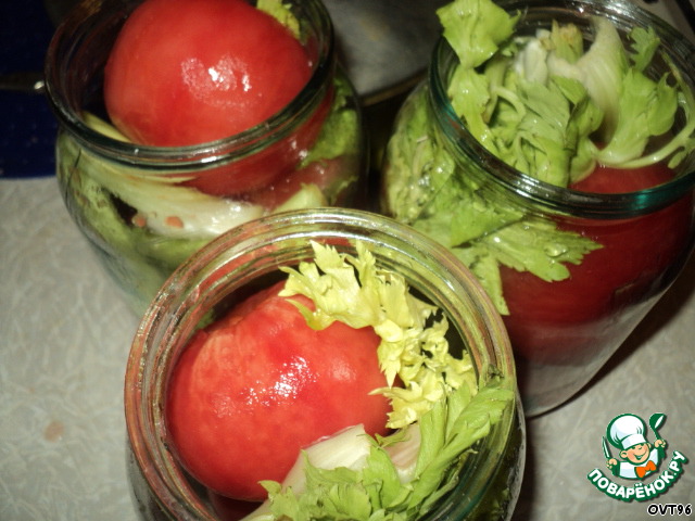 На дно банки положите мелко нарезанный чеснок, затем помидоры и сельдерей. Залить горячим раствором и закупорить банки.