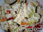 5. Соединяем капусту, перец и баклажаны, ручками аккуратно перемешиваем, чтобы овощи равномерно распределились в капусте.