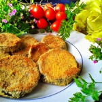 Готовим панировку. В сухари добавляем соль, перец, сухое орегано (душица), раздавленный в прессе чеснок и сыр (я использовала сулугуни). На блюдце насыпаем муки, в мисочке взбиваем венчиком (или просто вилкой) яйца