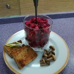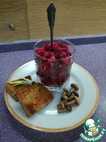 Кладeм в миску свеклу, картофель, лук, грибы, заправляем растительным маслом, уксусом, солим, перчим. Перемешать и дать около часика постоять.