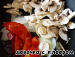 На сливочном масле обжарить в течение 5 минут нарезанные ломтиками шампиньоны, лук полукольцами и дольки помидоров (можно добавить болгарский перец соломкой). Посолить, поперчить.