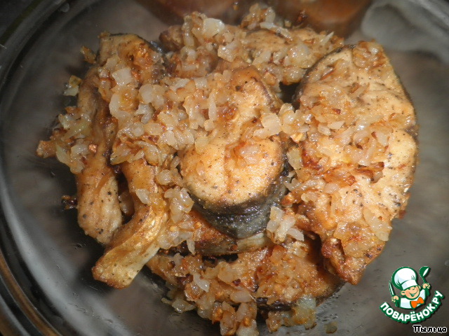 Жареный толстолобик с жареным луком. Карри придает рыбе не только пряный аромат, но и золотистый цвет.