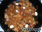Как только мясо слегка обжарится, добавить нашинкованный лук, все перемешать и продолжать обжаривать.