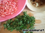 В это время расчленяем гранат, мелко режем петрушку и слегка измельчаем кешью.