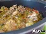 Овощи добавить к курице, влить бульон и тушить под закрытой крышкой минут 30.