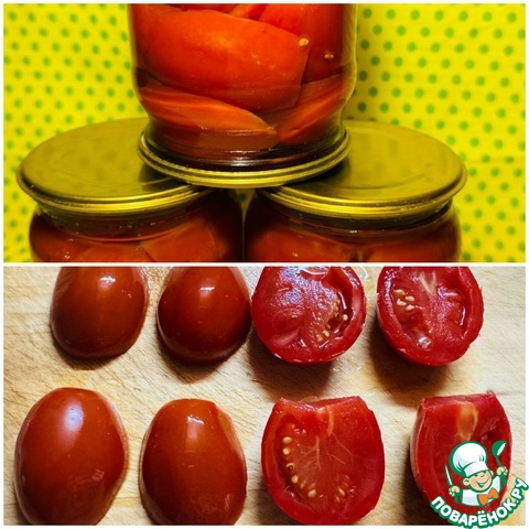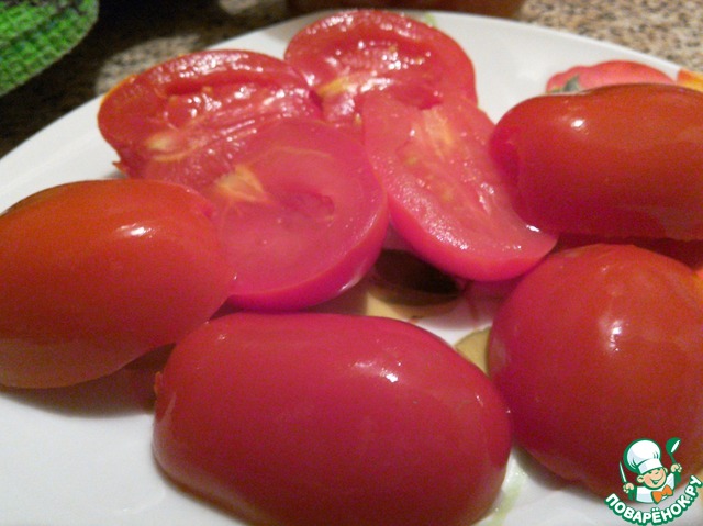 Здесь же скажу, что помидоры действительно как летние, шкурка при нарезании не слезает. Я забыла написать в своем посте, что я вырезала специальным приспособлением попку у помидора, а потом уже, следуя рецепту, разрезала помидор на две части.