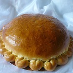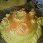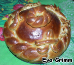 Теперь оставляем каравай в печи еще на 30 минут, раз в 10 минут я его смазывала смесью желтка с водой. Так же у меня был золотой пищевой порошок для украшения, я после выпечки прошлась им по "выпуклостям", и он здорово оттенил формы хлеба.