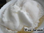 Желтки смешиваем с сахаром (один оставим для обработки выпечки), а белки отдельно взбиваем в пену. Необязательно так сильно, как у меня, достаточно - просто хорошо их перемешать до образования пенки сверху.