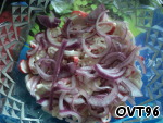 Замариновать лук. Лук красный или белый (по эстетическому вкусу), один стакан воды, 2 чайные ложки уксусной эссенции - 70% (4 столовый ложки столового уксуса – 9%), 1 столовая ложка сахара, 1 столовая ложка без горки соли.