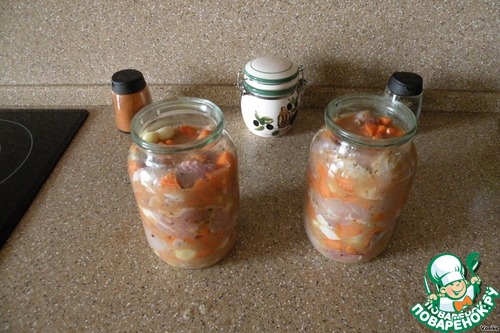 Очень плотно, слоями, складываю всe это в банки. Если утрамбовано недостаточно, доливаю вина, чтобы курица была покрыта. Банку не заполняйте сантиметра полтора до верха, иначе будет выплескиваться.