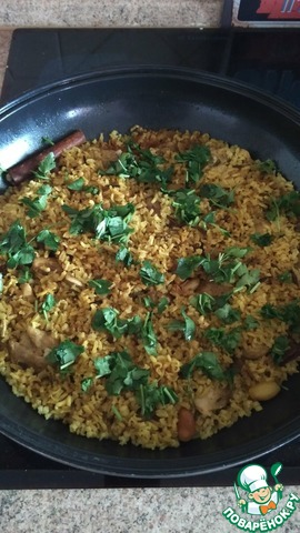 Ну а теперь выкладываем на сковороду сначала меньшую часть полуготового риса, сверху - зажарка.