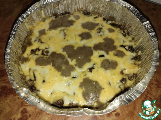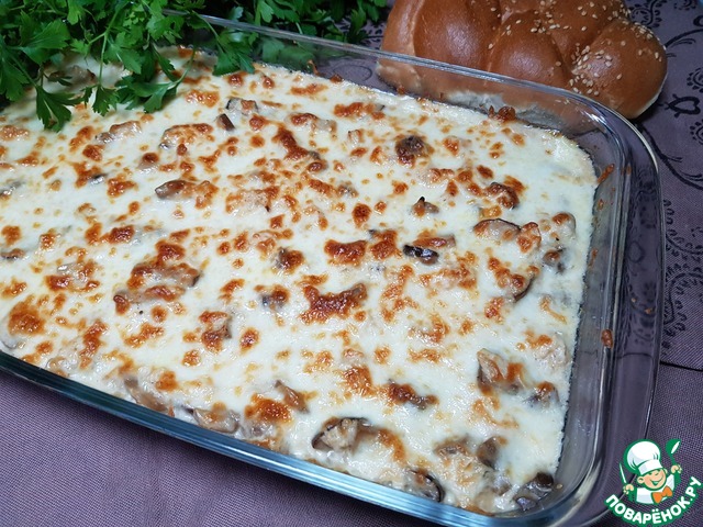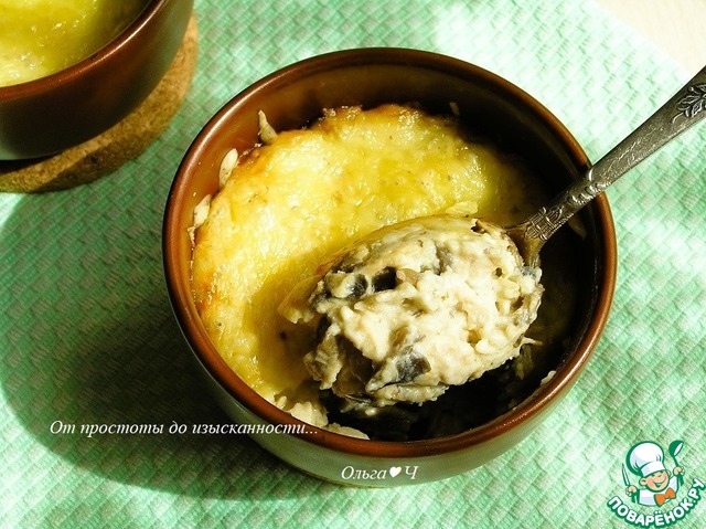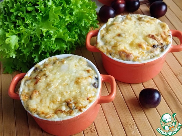 Нагревать до тех пор, пока соус не начнет густеть. Смешать грибы, курицу и соус, убрать с огня. Сыр натереть на мелкой терке. Грибы с соусом выложить в кокотницы. Посыпать сыром. Поставить в духовку.