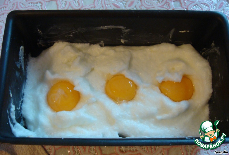 Форму смазываем маслом, выкладываем белковую массу, слегка ровняем поверхность, делаем в белковом облаке углубления и помещаем в них желтки.