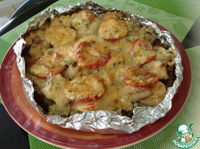 Дальше, рыбу закрываем кружочками помидор (можно и без них).