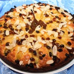 Пирог слегка остудить, смазать глазурью и посыпать миндальной стружкой.